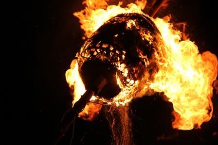 ぶつかり火の粉が飛び散り、ローソクが落ちてきて