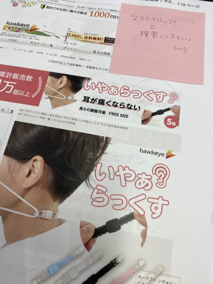 さて、先日ブログでマスクをしていると耳の裏と頭が痛くなり、仕事に集中できないという話をしましたが、従業員が気を利かせてくれて、対策案を見つけてくれました。