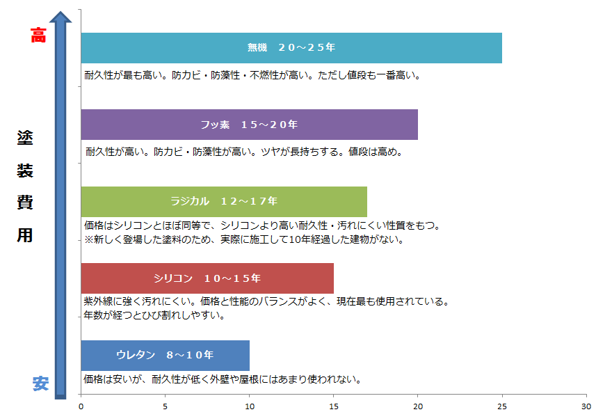 耐用年数が長い塗料は値段も高いので、1回の塗装費用は高くなります。