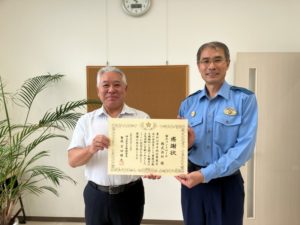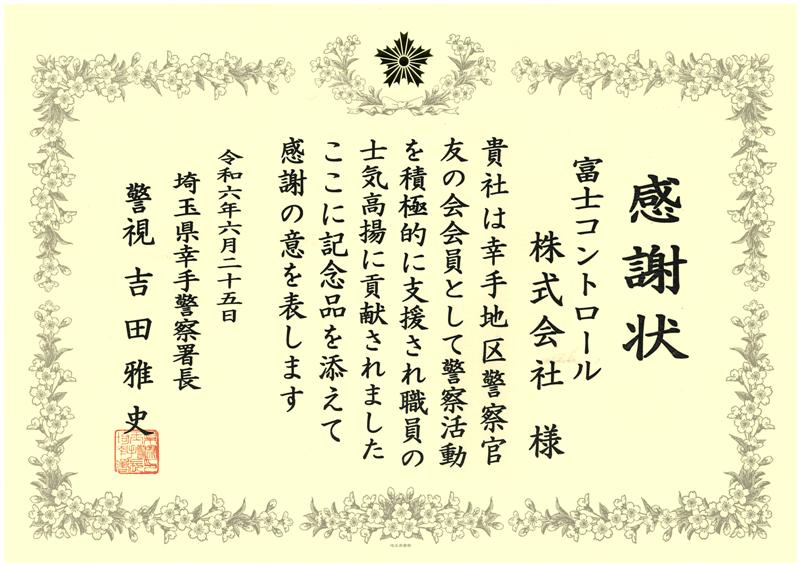 この度、幸手地区警察官友の会の活動を通じ、長年の警察官活動・支援に対する功績が認められ、幸手警察署、吉田署長より感謝状をいただきました。