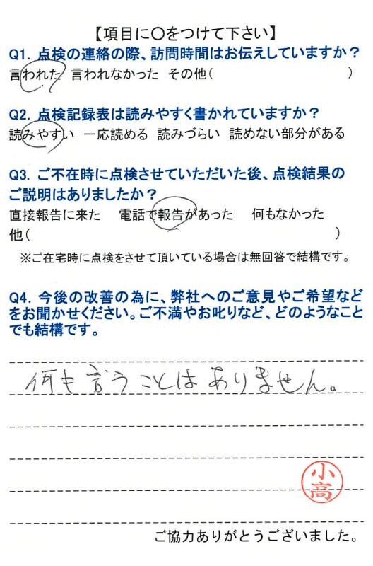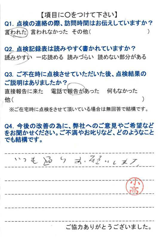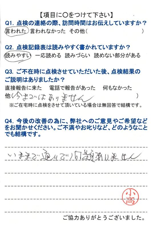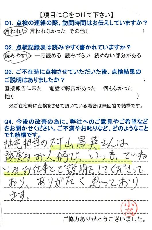 【ご意見】 拙宅担当の村山昌英さんは誠実なお人柄で、いつも丁寧なお仕事と説明をして下さっており、ありがたく想っております。