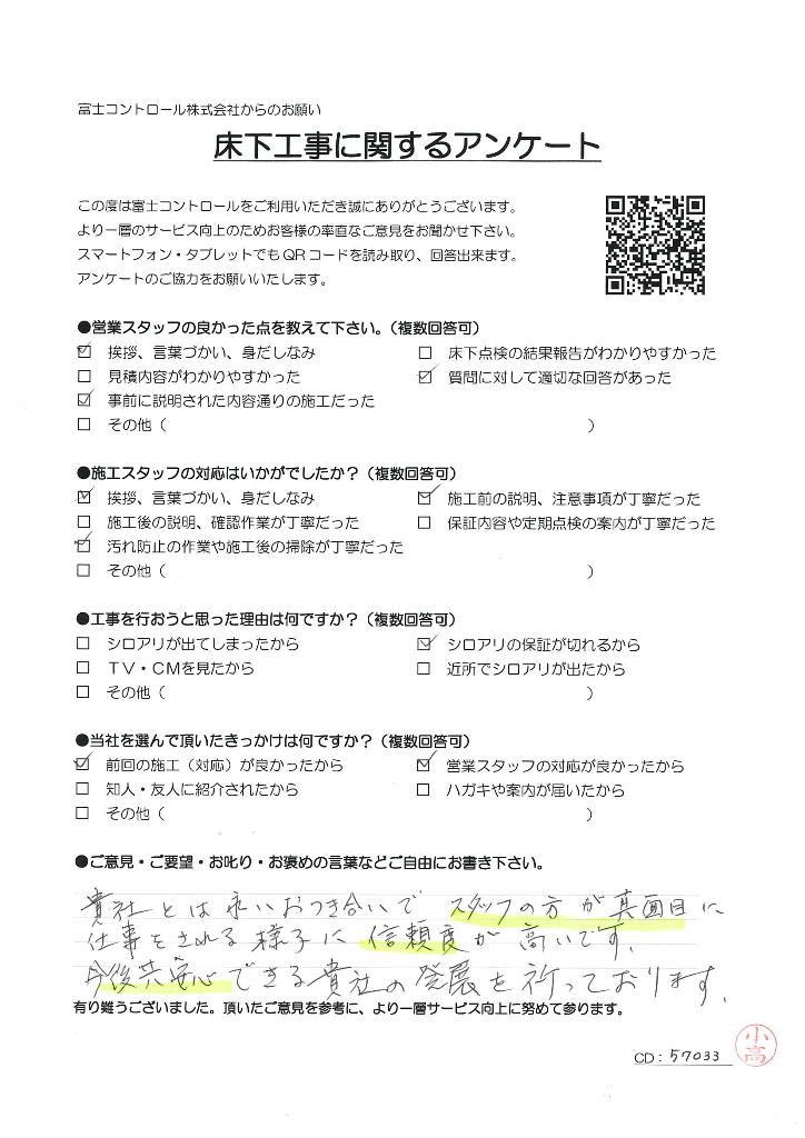 【ご意見】 貴社とは永いお付き合いで、スタッフの方が真面目に仕事をされる様子に信頼が高いです。今後とも安心できる貴社の発展を祈っております。