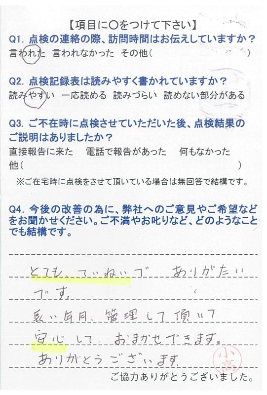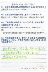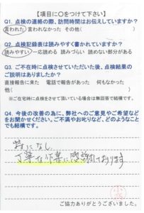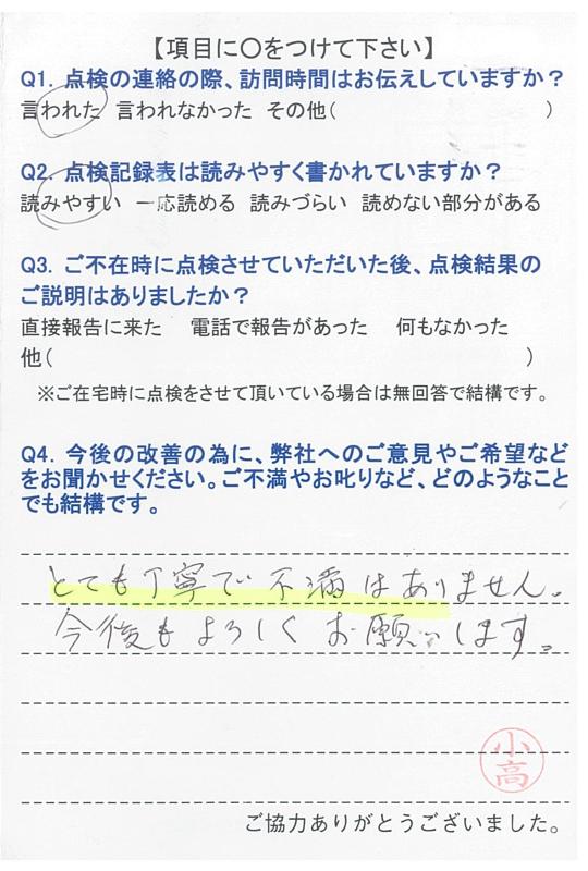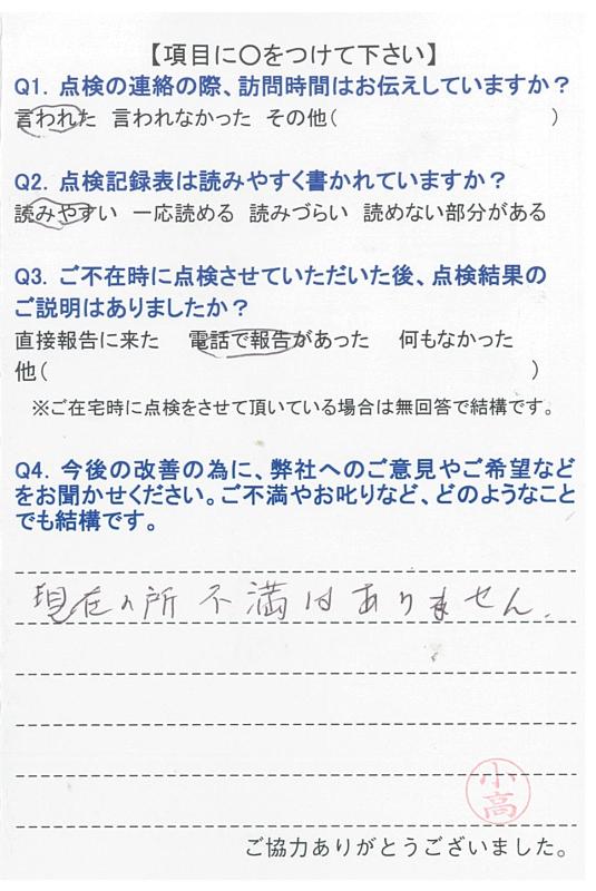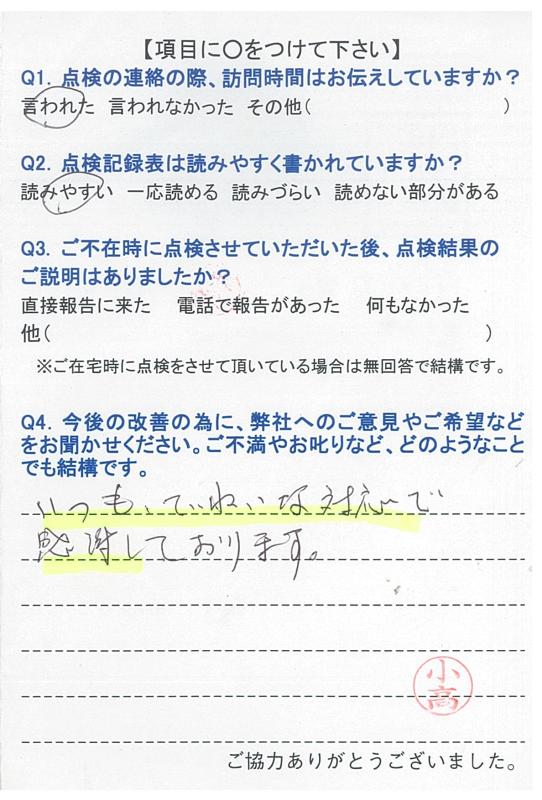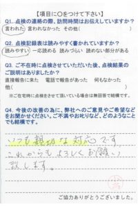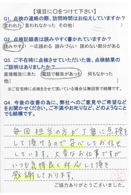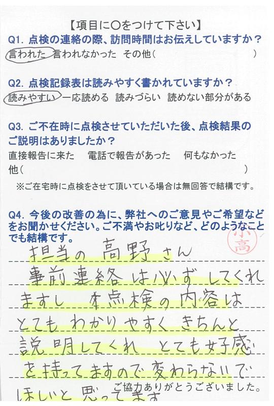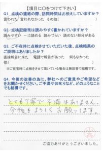 お世話になっています。点検の訪問時間の連絡や、点検終了後の説明、いつもきちんとして頂いています。今後も宜しくお願いします。