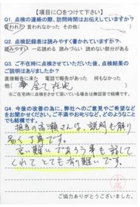 毎回丁寧に点検して頂いております。これからも宜しくお願いします。