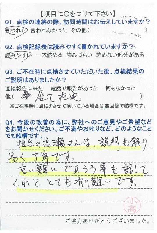 高瀬様は特に素晴らしく、感謝しています。担当の方はいつも丁重で、時間厳守です。大変満足しています。(今までの担当の方全てです)年4回の点検をきちんとして頂くので、安心して使用できます。今後とも、宜しくお願い致します。