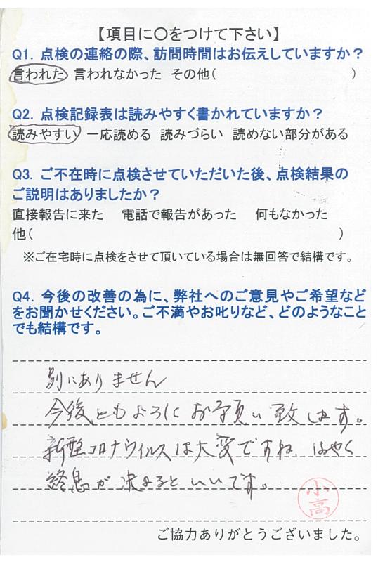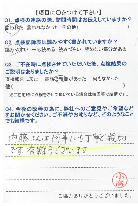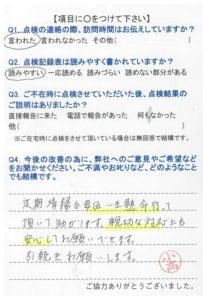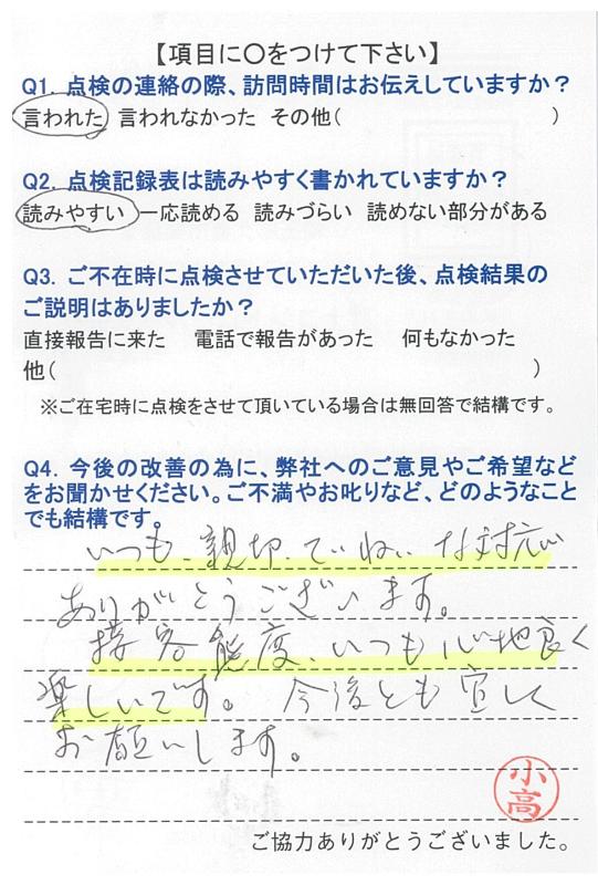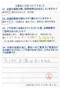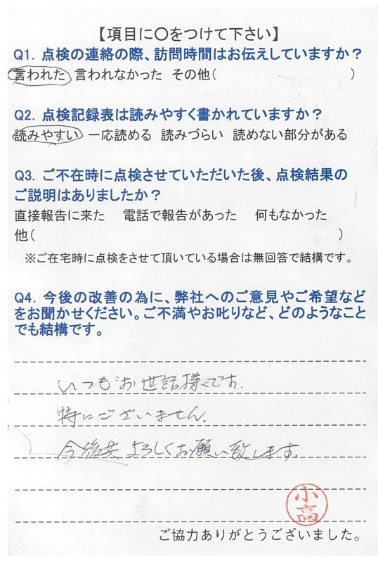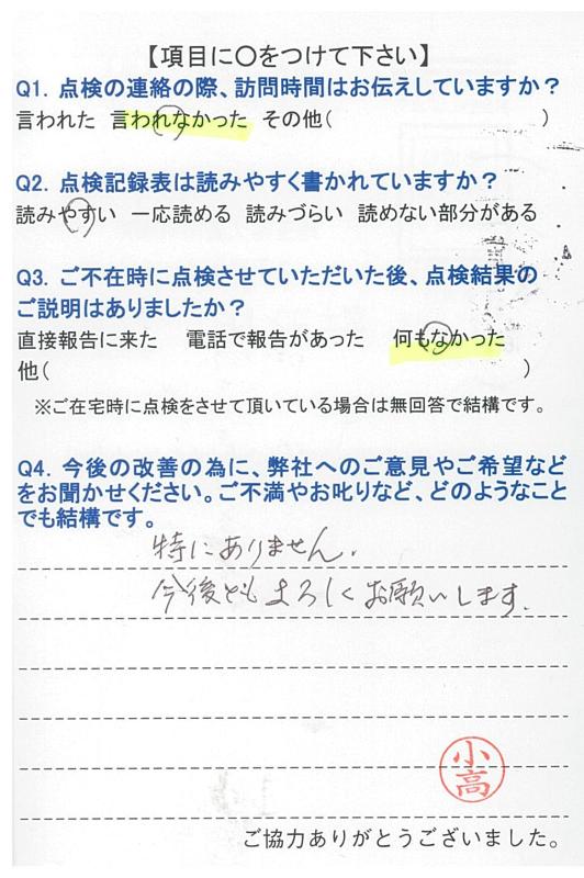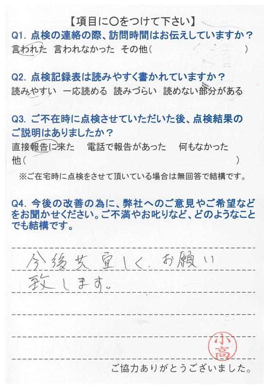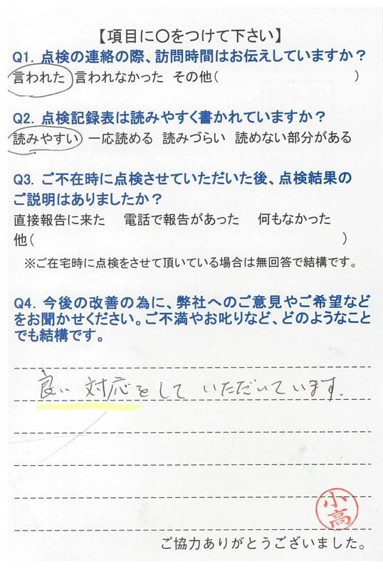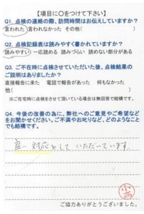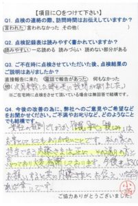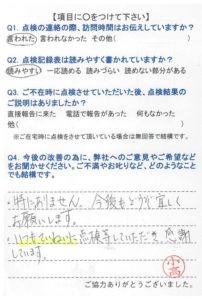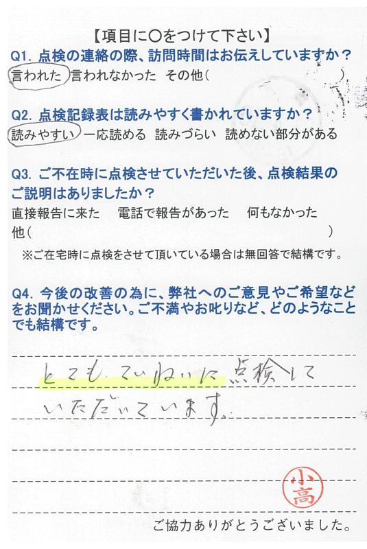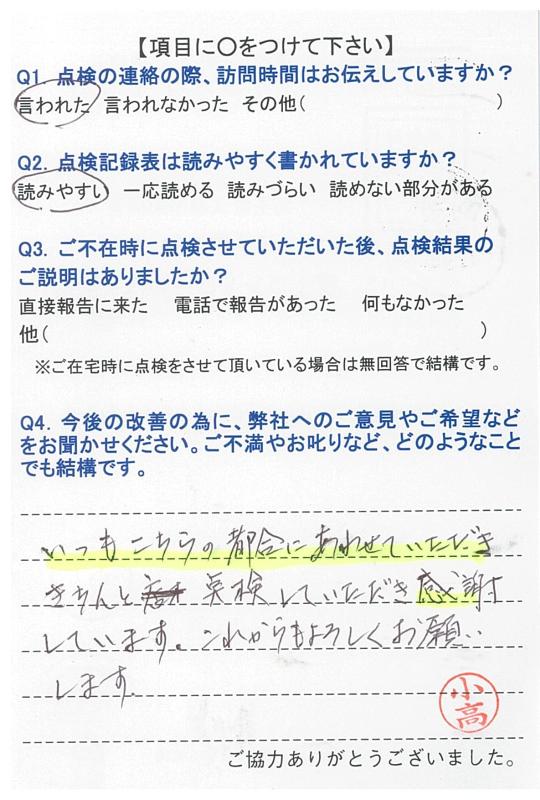 いつもこちらの都合に合わせて頂き、きちんと点検して頂き、感謝しています。これからも宜しくお願いします。