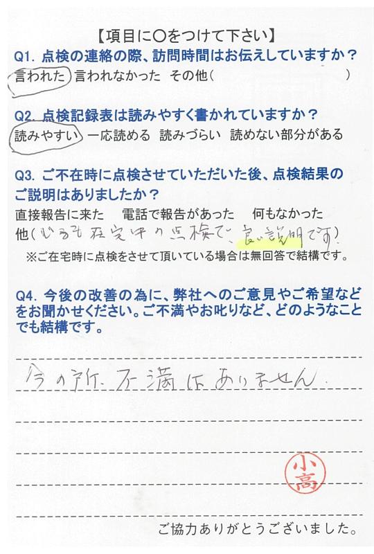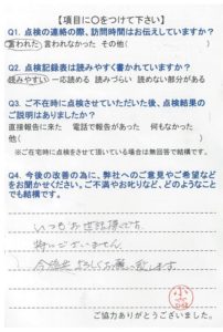私は午後出かけることが多いので、午前中にお願いしますと・・・点検前日にTEL連絡有りまして、明日10時に伺いますが、大丈夫ですか?と、時間まで言って下さるので、大変有難く思っています。これからも宜しくお願い致します。
