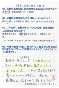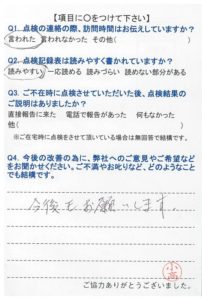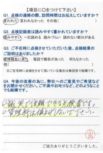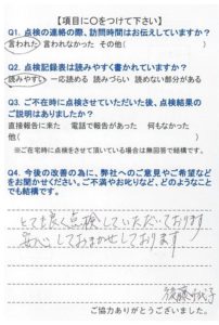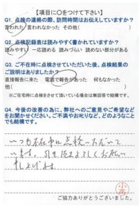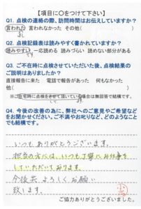 いつも丁寧に点検して頂いて、終わってからも結果を詳しく説明してくださるので、信頼できます。今後とも宜しくお願い致します。