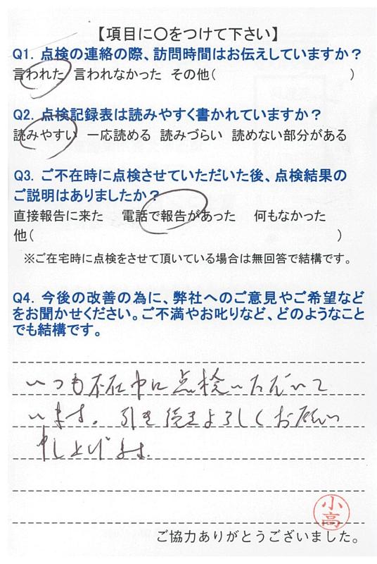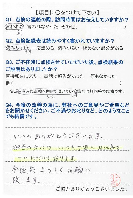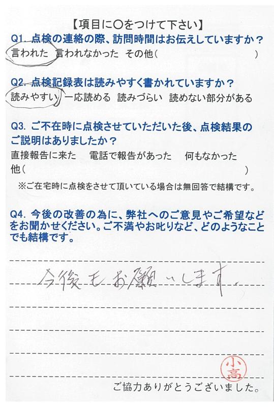 【ご意見】 いつもきれいに点検して頂き、ありがとうございます。 これからも、宜しくお願いします。 |