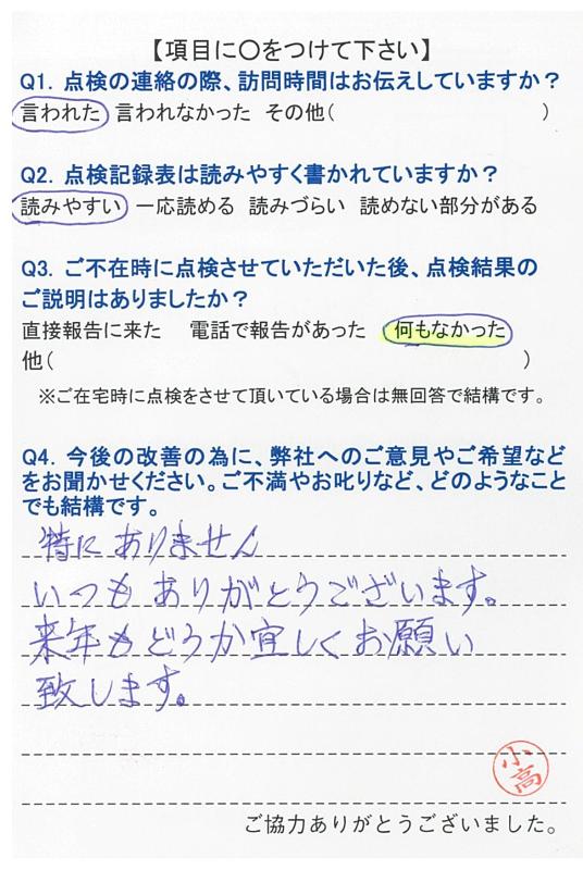 【ご意見】 点検者は良く気を遣って、よく説明してくれます。 変わらないで来て欲しい。 |