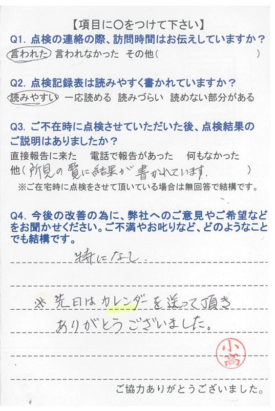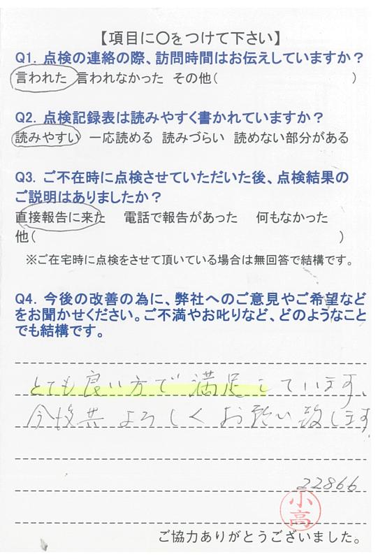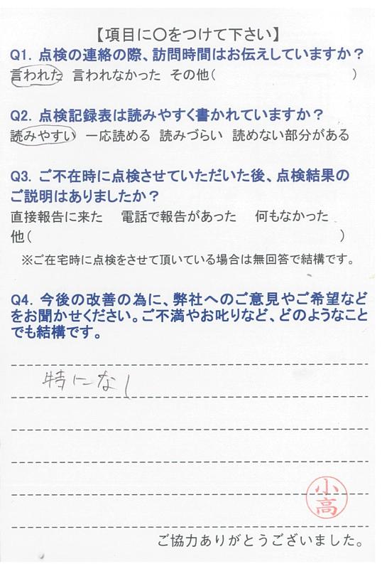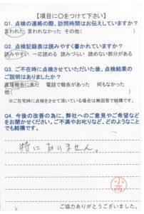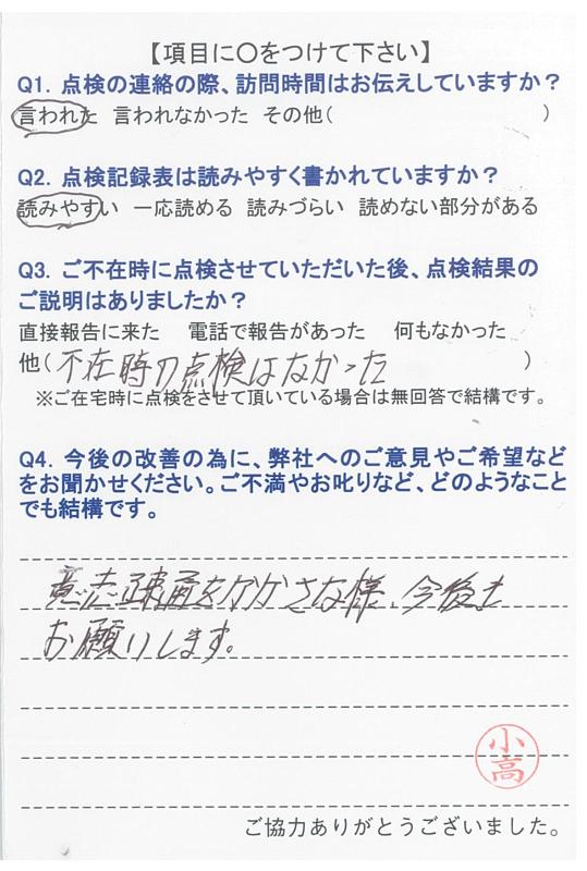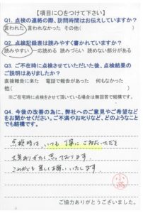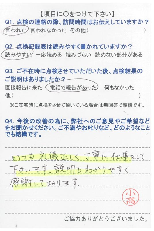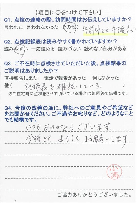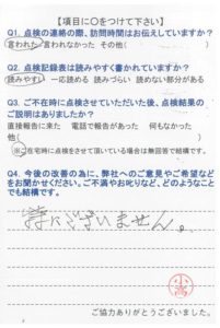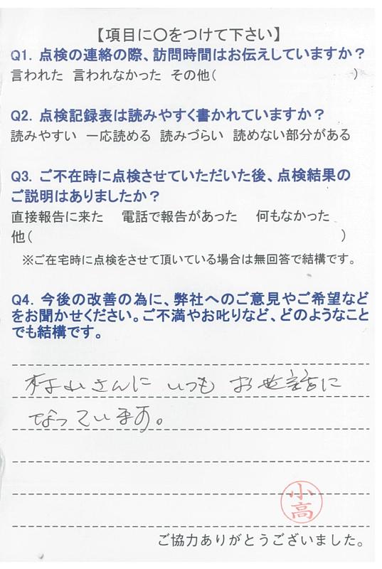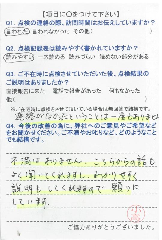 いつもいつも事前にご連絡を下さり、感謝しております。点検調査もいつもしっかりとご説明下さり、有り難うございます。申し分ございません。