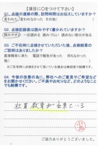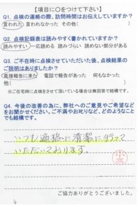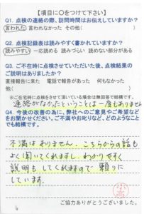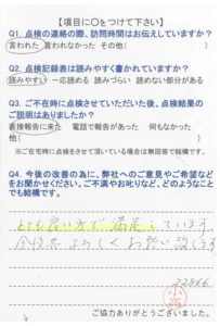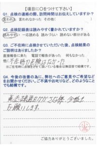 いつもお世話になり、ありがとうございます。点検時に、色々説明を解りやすく話して頂いて助かっています。今後も宜しくお願いします。